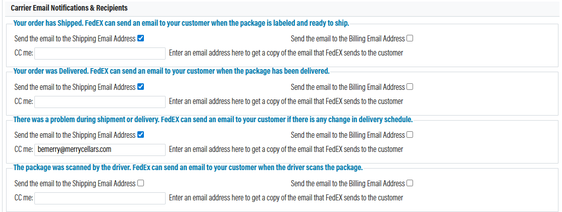After you have setup, your account will have the option to send automated emails to customers from FedEX when certain events occur. Please review the options and decide if you want to send these emails to the customer's billing or shipping address. If nessisary you can also cc someone at the winery.