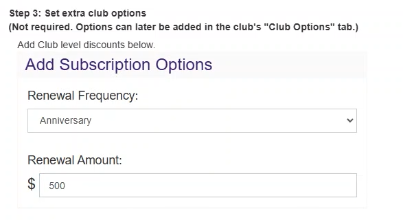Under the Subscription options, select a renewal frequency. If you select an anniversary, the customer will be charged each year.
