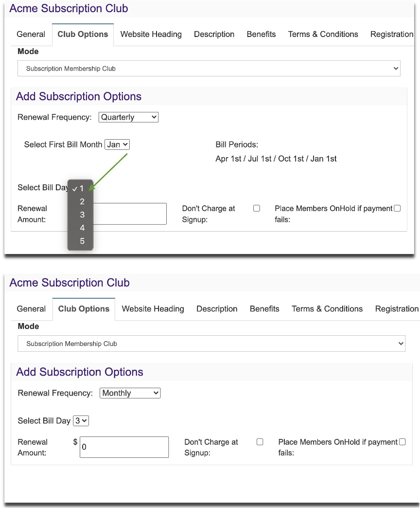 First, choose the frequency of the billing cycle. Then choose the renewal amount. This is the amount of money customers will be billed during each cycle. If you choose to bill quarterly, semiannually, or annually, you can specify which months members will be billed. Additionally, you can choose a specific day of the month on which the billing will occur. Billing will occur automatically on the morning of the day you choose. Make sure to click Save when you are done. You can change your billing cycle if you need to in the future.