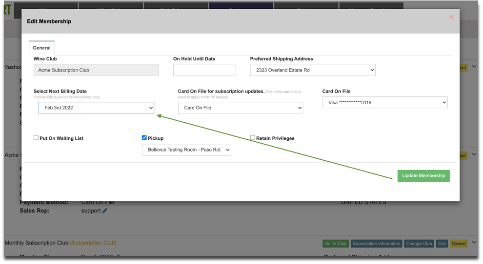 Subscription clubs support the ability to update a member’s next billing month. This means that they will stay on the same cycle as the other members, but will not be charged until the next month specified. In this example, the member is part of a subscription club with a monthly billing cycle. First, navigate to the member's account and click the Memberships tab. Click Edit on their membership to open the Edit window. Using the ”Select Next Billing Date” dropdown menu, choose the next month that you want the member to be billed. Then click Update Membership to save the changes.