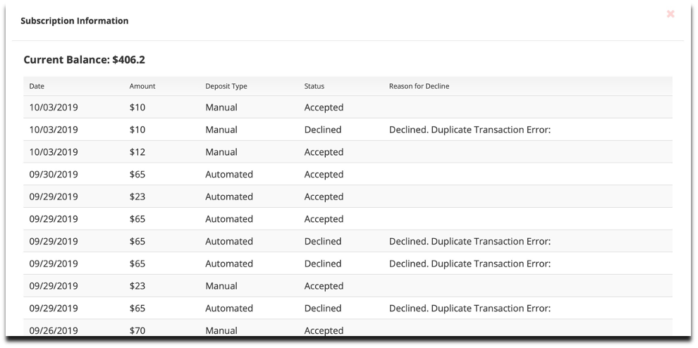 The Member Accounts module allows you to view deposits charged to a member’s card on file. Approved deposits will show in white, canceled in brown, and declined in red. It also allows you to view transactions made with their balances. Those will show as transaction type Sale.