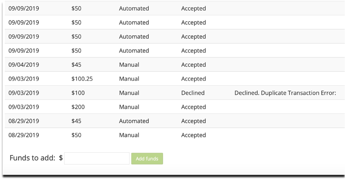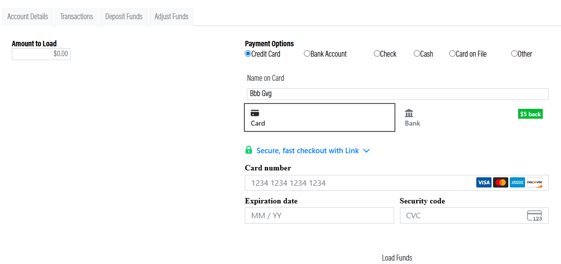 The member’s card on file can be used, as well as cash, check or a credit card that is not currently of file. Enter the amount that will be deposited, choose the payment method and click Load Funds.