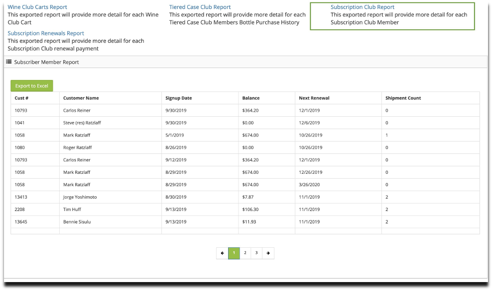 This report will show each subscription club member's current account balance. This is how much money they have to use for purchases at the winery. The Next Renewal field shows the date on which their next automated payment will be charged to their card on file.