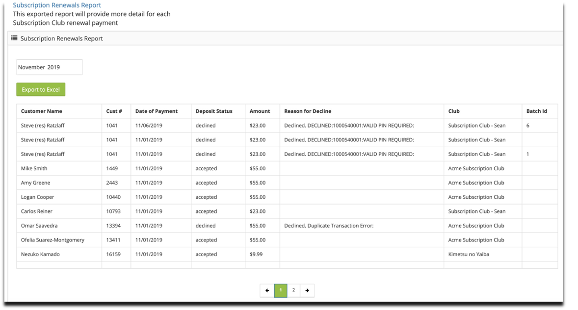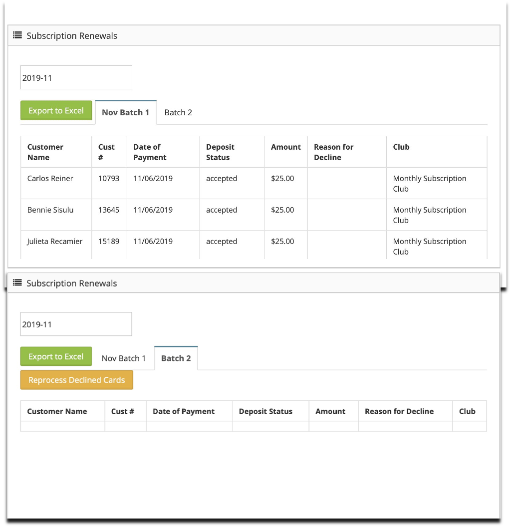 The Subscriptions Renewal Report will show member payments for each billing cycle. It breaks down which payments were successful and which weren’t. Since declined payments can be reauthorized, it will show which batch each payment was a part of.