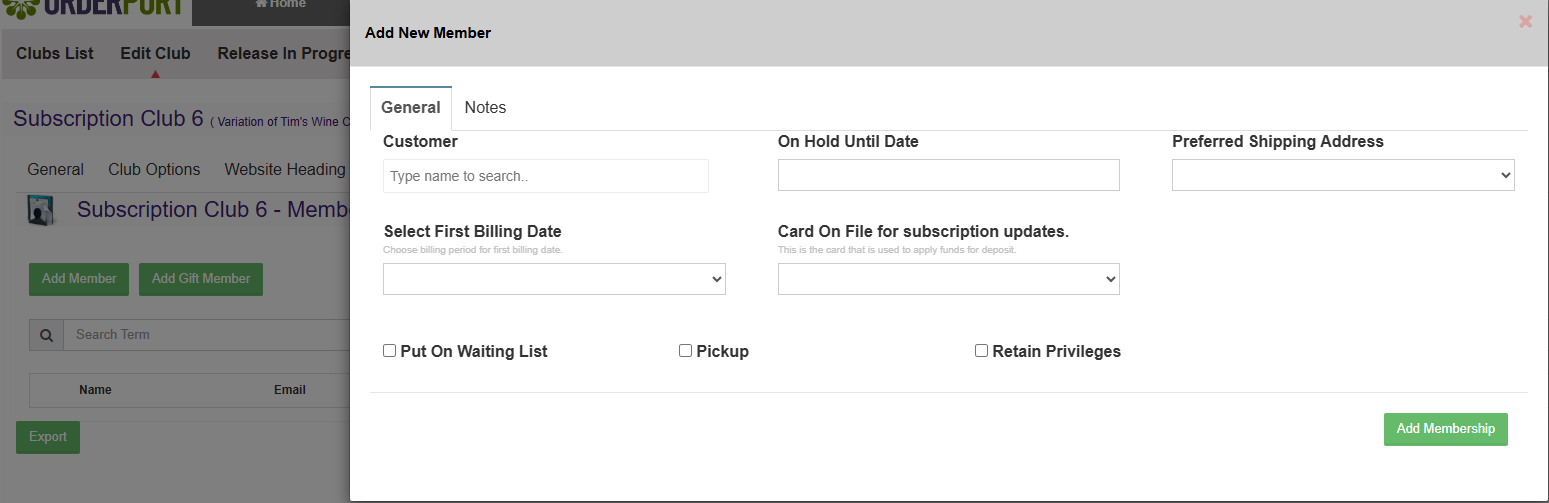 To create a subscription club, go to the Wine Clubs tab, click create club, then select the Subscription Membership Club option from the dropdown. Fill out all the information.