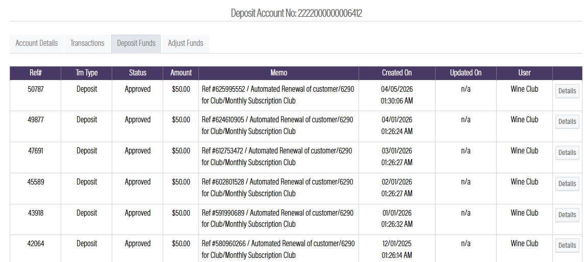 You can view member deposits in each member’s account in the Wine Club module. On the Member’s Memberships tab, there is a button called