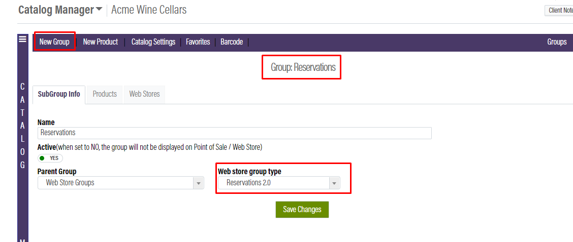 - Next, give your group a name and choose "Reservation 2.0" from the dropdown menu labeled "Web Store Group Type."