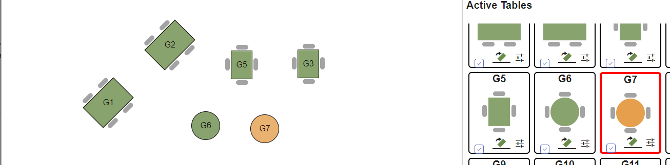 The OrderPort Table Map allows you to have a visual and interactive page where you can see your table layout. To access this from your OrderPort Five app, select the tables button. If you have multiple maps, scroll from left to right to see your other areas. Green tables are available and ready for customers. Once you select a table, it will allow you to search for a customer and enter the number of guests. If you select too many guests for that table, it will notify you to select an additional table or that this table is not combinable. Once all needs are met, you can select to seat guests.