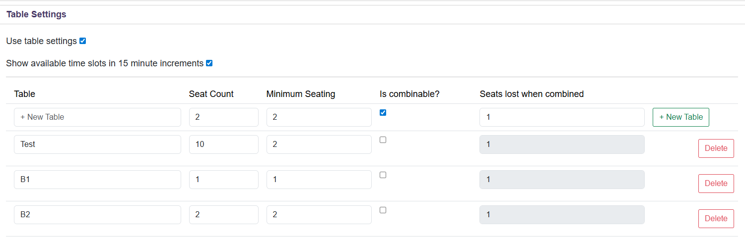 - In the table settings tab, enable table settings and set up your tables to match what is in your tasting room