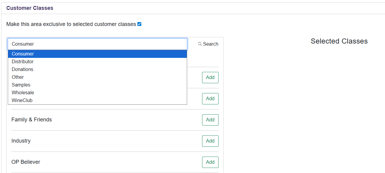 The Customer Classes tab allows you to restrict an area by customer class, making it exclusive to certain customers. Check the box to make it exclusive, then check the box for each customer class that will have access. This means customers will need to sign in during the reservation process, so their customer class is recognized. Click Save when done.