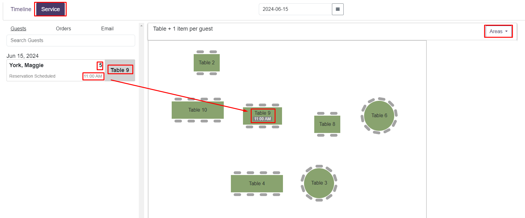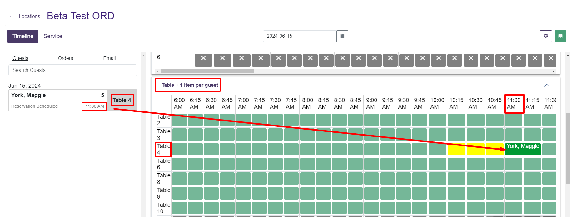 If you choose to assign tables from the timeline page, this allows you to quickly change the time of your guest's reservation. You can also change the area and the duration of their reservation. Click and drag the reservation you want to the desired area, table, and time slot.