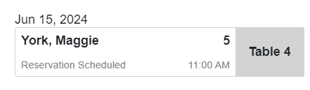 The list of reservations includes basic information such as party size, date, time, and the currently assigned table. Clicking on a reservation will provide you with further details.