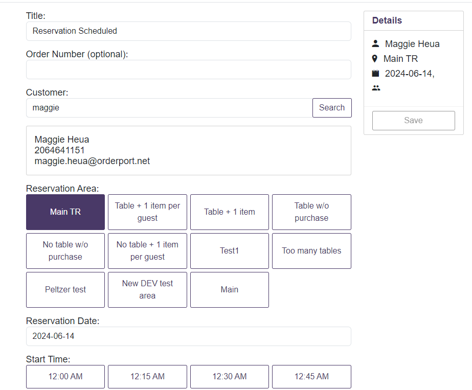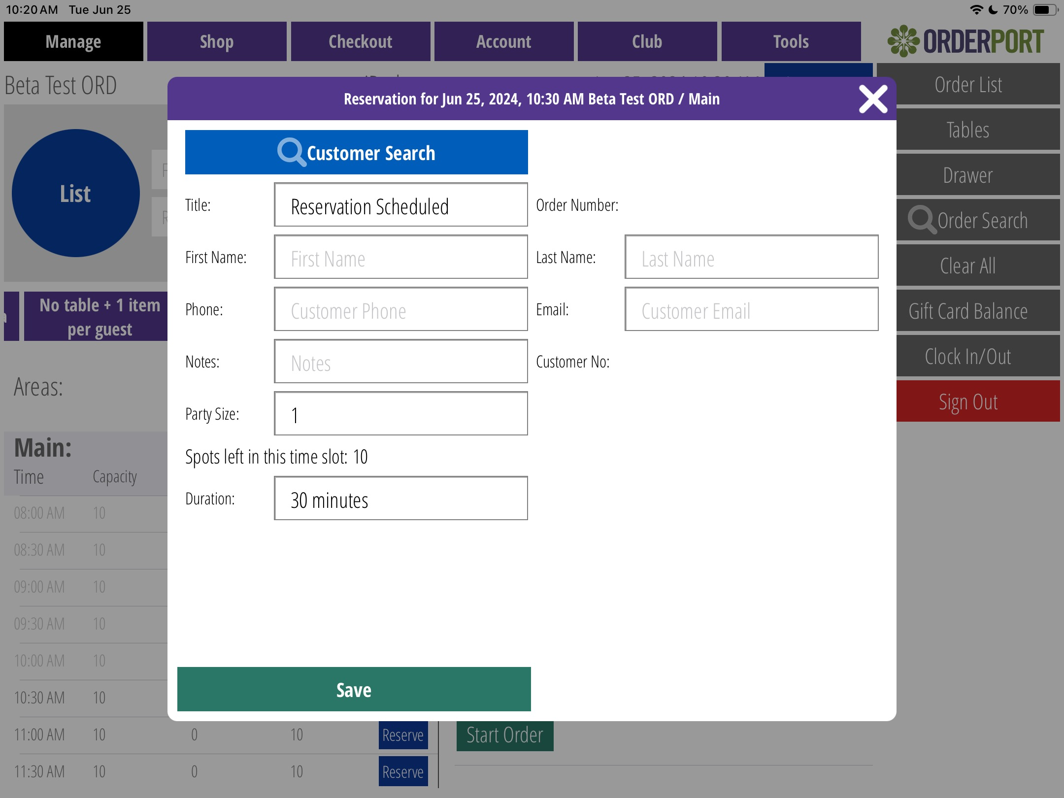 - Enter the customer’s contact information, party size, and confirm the time slot length.