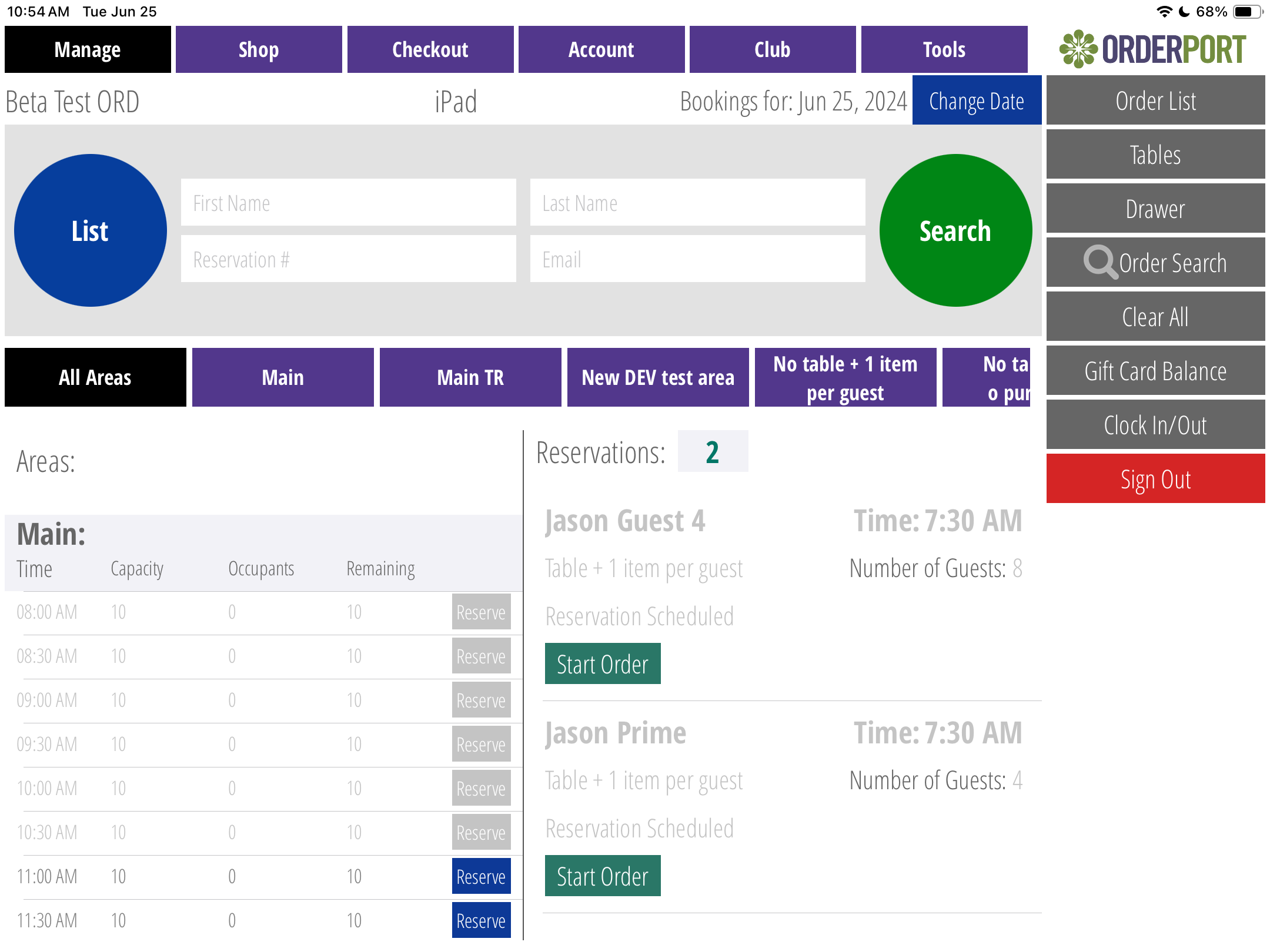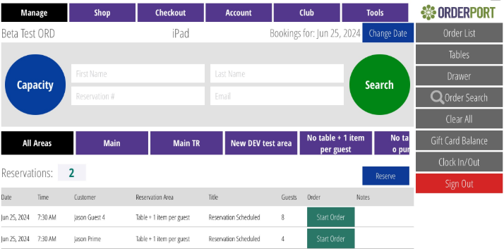 In the OrderPort app, the Reservations tab allows you to view existing reservations. On the right-hand side of the app, you will find a gray bar with a button labeled "Reservations." Once you select this button, you will be directed to a screen displaying all your reservation areas for the selected tasting room location.