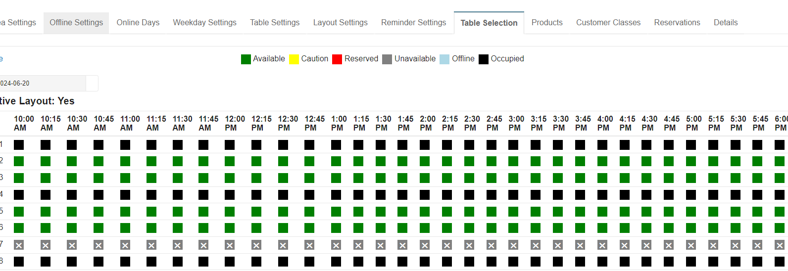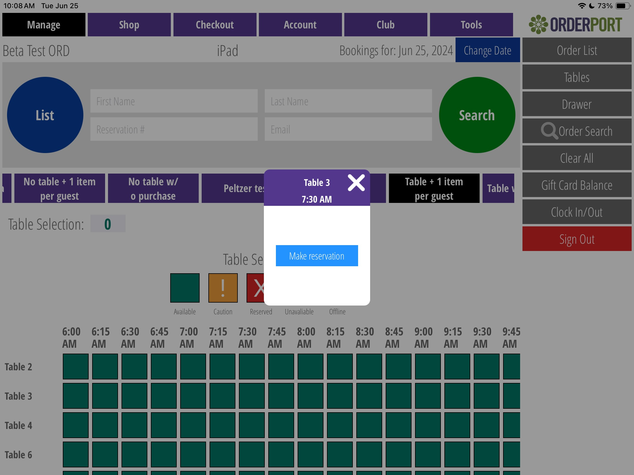 The Table Selection tab allows you to both create and manage reservations. Here, you can: