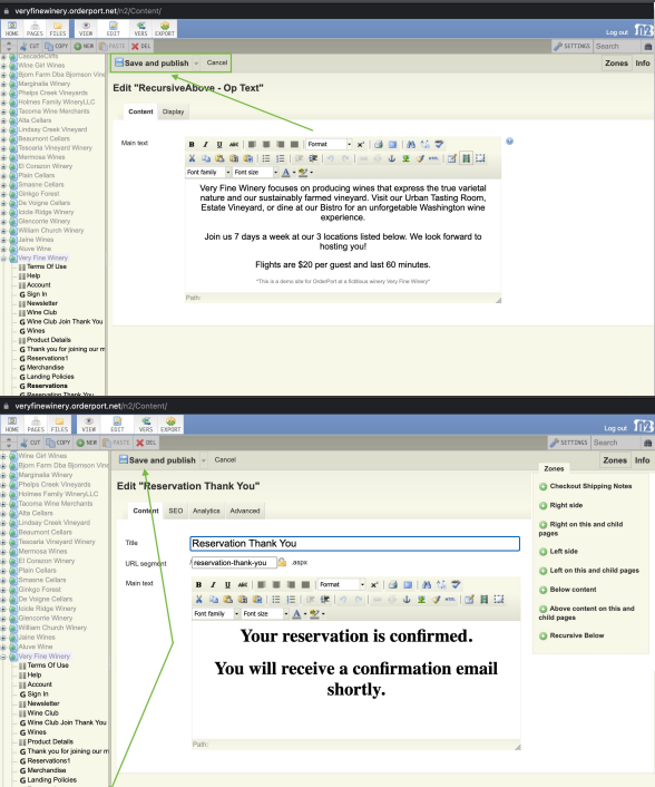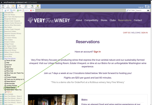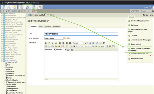 When you open the Webstore Designer, you will see your OrderPort pages listed on the left side of the window. To view your current landing page, click on "Reservations." If you need to edit the language, click "Edit" in the top left corner of the window. Then select "Zones" and choose "RecursiveAbove - Op Text."