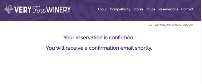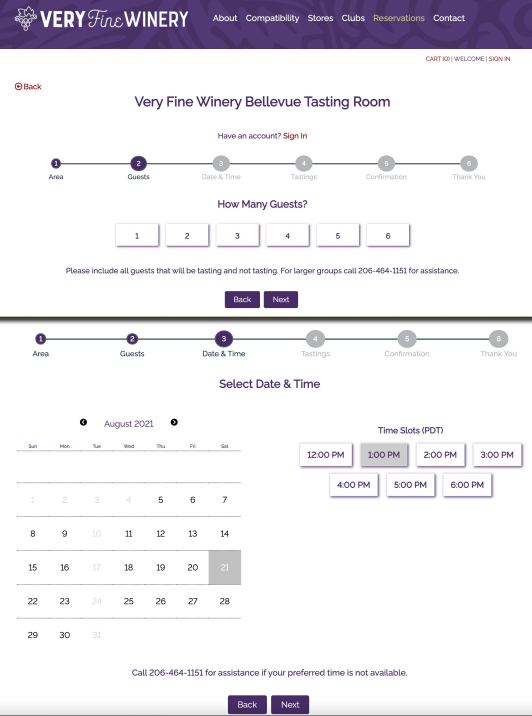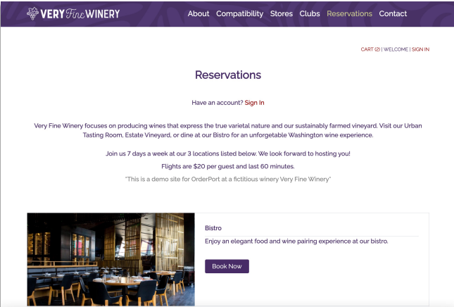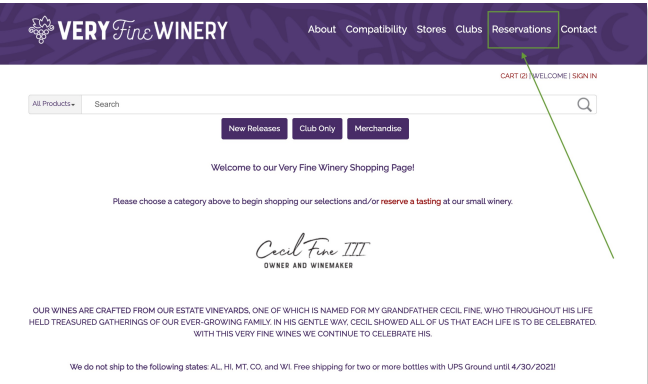 Once your location settings and options are set up, you can make reservations active on your webstore. Your website team can make a new tab or button that can be linked to the main reservations page. In this example, the winery has placed a link in the website’s header that customers can click to get started.