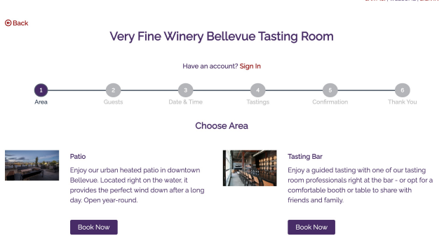 After the customer chooses a tasting room, they will be asked to choose an area. This is Step 1 of the process. Clicking Book Now will take them to Step 2. If your location only has a single area, the customer will still need to complete this step.