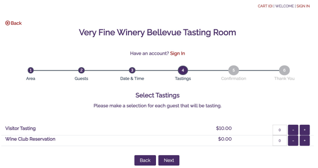 Step 4 will follow if your winery currently has a policy of requiring a deposit to book a reservation. All available products for that area will appear, and they will add each item they want to prepay for. When done, they will click Next. If your business is not currently having customers make deposits, they will move straight to the confirmation screen on Step 5.