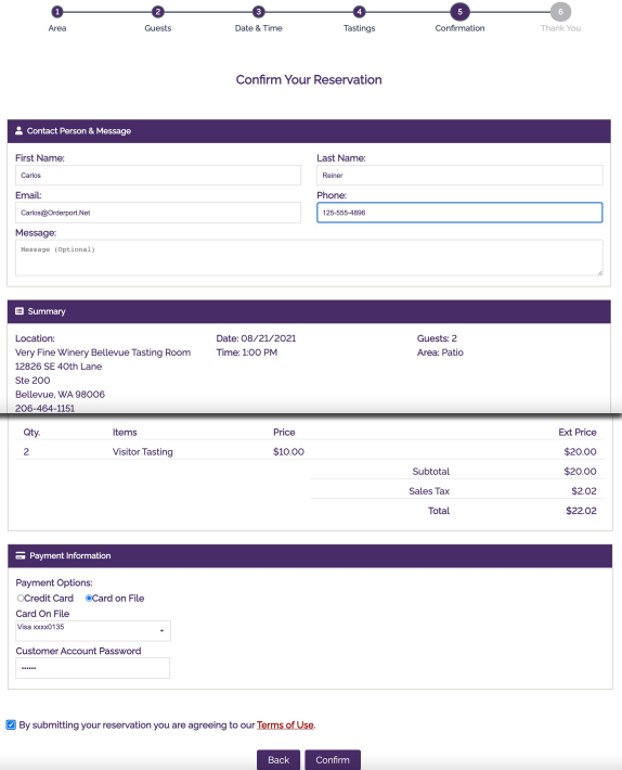 On Step 5 the customer will enter their contact and payment information. If they have already logged in, their account information will autofill. If the customer doesn’t have an account, they will enter this information by hand. If they have an account they can pay with a card on file. Non account holders will enter card information that is then put on file, ensuring you can charge a no-show fee is necessary. After all contact and payment information is entered, they will click Confirm.