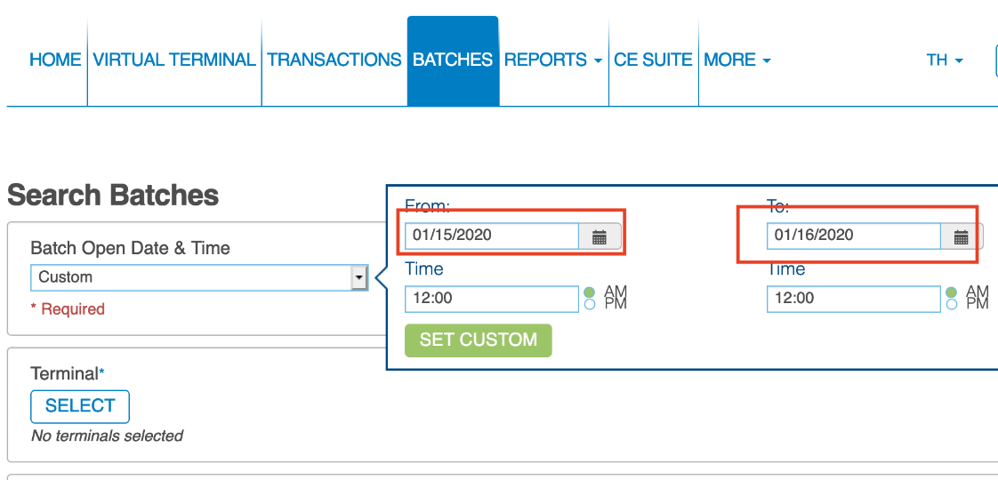 In OpenEDGE, you'll need to go to the Batches tab. If you are searching for a specific day, you'll need to select the first date as the date you want and the second date as the following day.