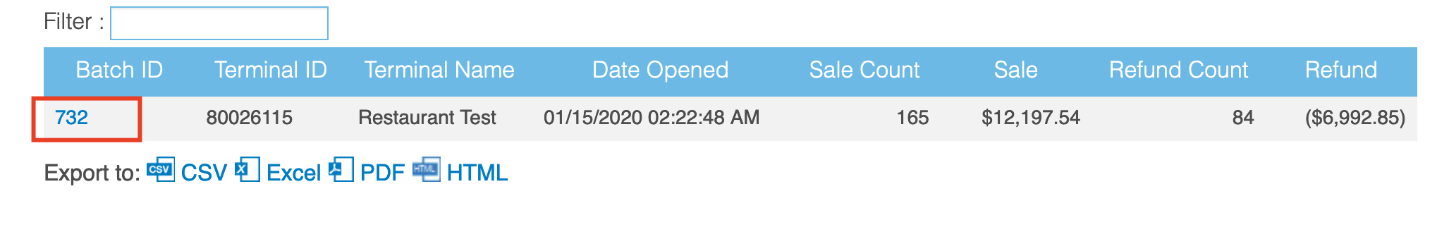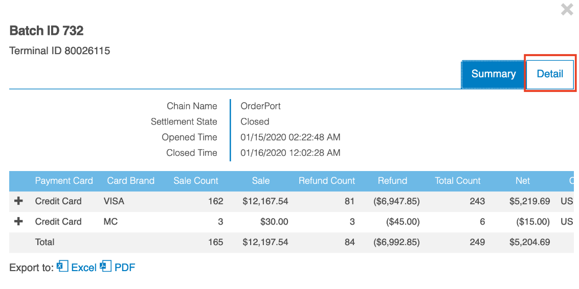 Click on Detail. Here you'll see the Transaction ID. You'll match them to the PNREF column of the previous report. You can export both reports into an excel file to make it easier for you to reconcile.