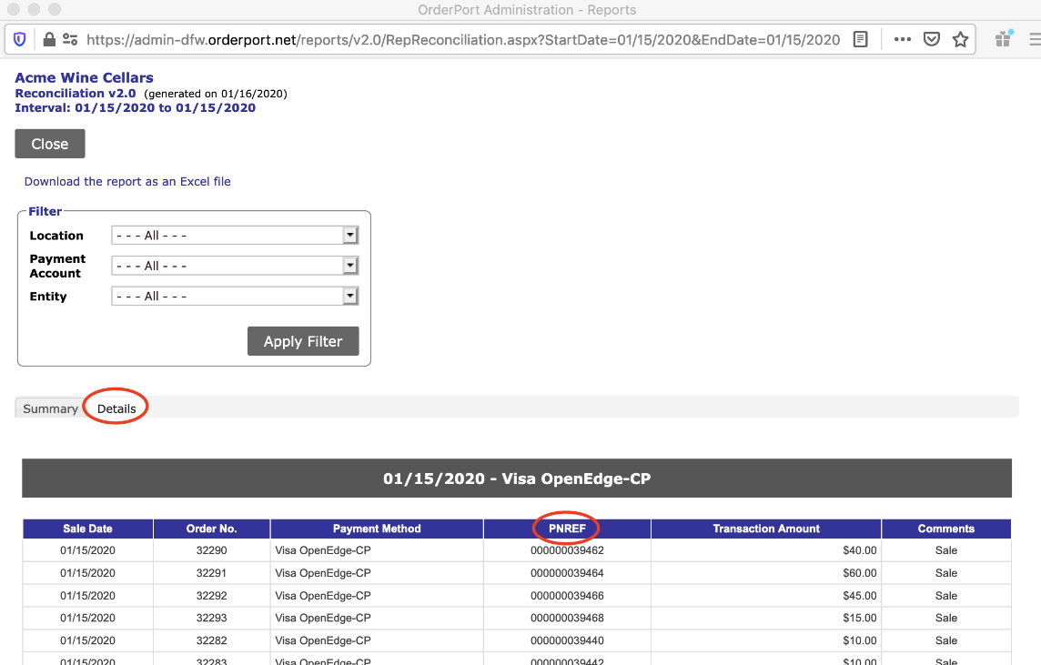 OpenEdge view is the payment processor portal. In OrderPort, run the reconciliation report (Normally done day by day). Go to the Details tab, here you'll reference the PNREF column.